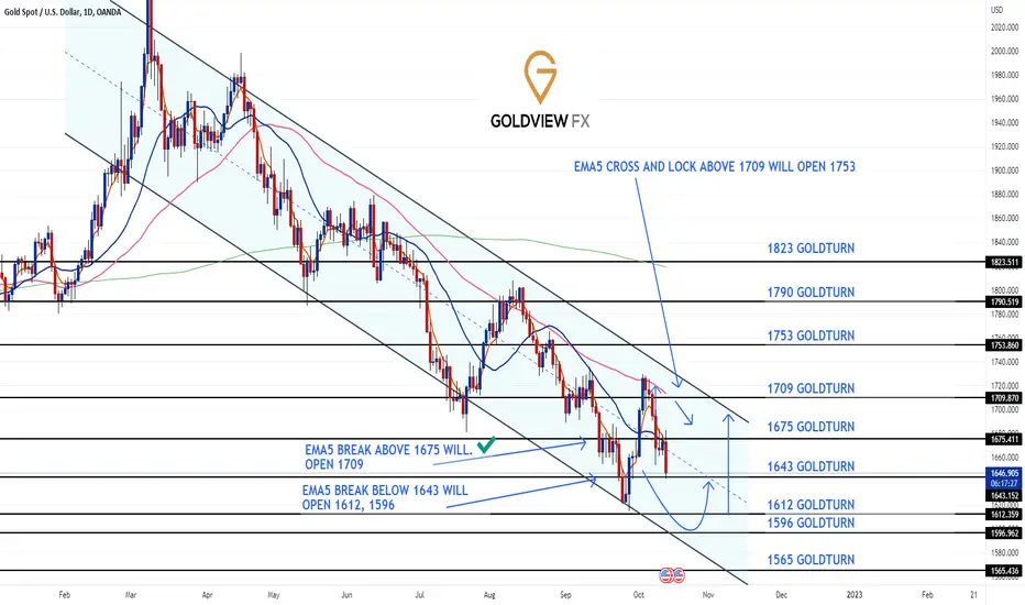 Our descending Goldturn channel on the daily chart is being respected well, and price is now testing and respecting 1643 Goldturn. We will still need to see a cross and lock below 1643 to see the lower Goldturns down to 1612-1596, or we will see a retest back to 1675.