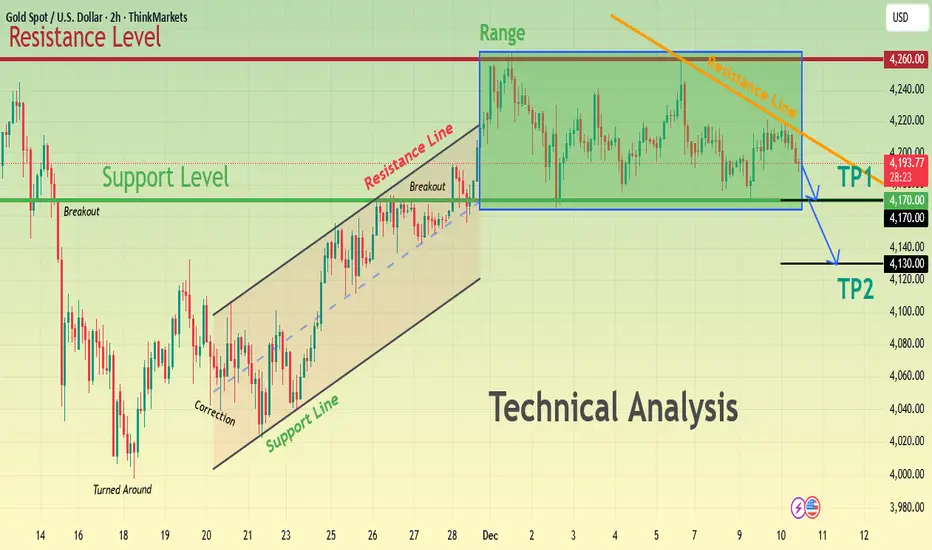 Hello, traders! Here’s my technical outlook on GOLD (XAUUSD) based on the current market structure visible on the chart. After a strong rebound from the previous lower demand area, price moved into a steady ascending structure, respecting the rising Support Line and forming higher highs and higher lows. This bullish impulse later transitioned into a corrective consolidation, where Gold entered a well-defined range below the major 4,260 resistance level. The repeated rejection from this resistance confirms strong selling pressure at the top of the range, while buyers continue to defend the 4,170 support level, keeping price compressed between these key boundaries.Currently, XAUUSD is trading inside this consolidation box, while also respecting the descending short-term resistance line from the recent swing highs. The market previously broke out from the bullish channel and is now showing signs of weakness beneath the upper boundary of the range, suggesting that upside momentum is fading. As long as price remains capped below 4,260, the risk of a deeper corrective move remains elevated.My primary scenario is bearish as long as Gold stays below the 4,260 resistance and continues to respect the descending resistance line. I expect price to gradually move lower toward the TP1 target at 4,170, which is the first key support inside the structure. If selling pressure accelerates and this level fails to hold, the next downside objective stands at TP2 around 4,120, where stronger demand could emerge. A clear breakdown below TP1 would confirm bearish continuation. However, if price reclaims 4,260 with strong momentum, this bearish setup would be invalidated and the bullish trend could resume. For now, the structure favors a corrective pullback toward 4,170–4,120. Please share this idea with your friends and click Boost 🚀