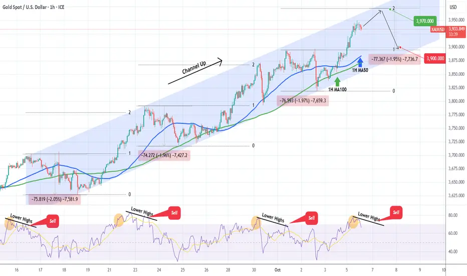 That should take us to 3970, which would be right at the top of the Channel Up (Higher Highs). A 1H RSI Lower Highs rejection would be the sell signal, targeting the 1H MA100 (green trend-line), like both previous Bearish Legs did, at 3900.