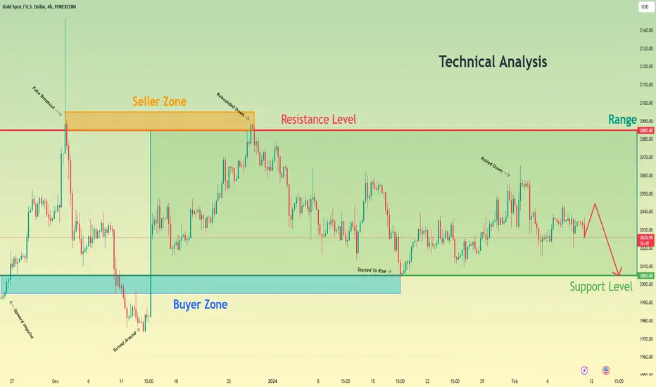 Hello traders, I want share with you my opinion about Gold. By observing the chart, we can see that the price some days ago made a strong upward impulse from the buyer zone to the seller zone, breaking 2005 and 2085 levels. But soon, the price turned around and in a short time declined back, breaking these levels again. Next, the price turned around and bounced up higher than the 2005 support level, thereby breaking it and entering to range. Inside range Gold rose to seller zone one more time, where it soon turned around and declined back to range. In a short time later XAU declined to the 2005 level, after which it rebounded and started to move up. After the price rose to 2060 points, it rolled a little down, where it continues to trade to this day. So, I think that Gold can make little movement up, after which it turns around and starts to decline to the 2005 support level, which coincides with the bottom part of the range. So, that's why I set my target at this level. Please share this idea with your friends and click Boost 🚀