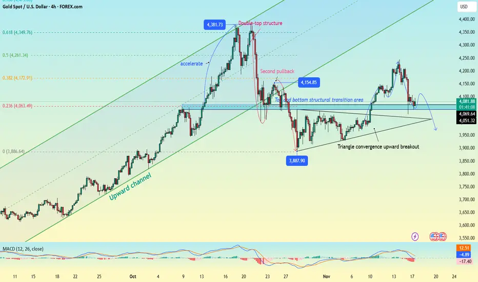 Reviewing last Friday's market, gold experienced a sharp drop before finding support near 4032 and rebounding 📈. However, the rebound encountered resistance again near 4111 overnight, and the price fell back. After opening today, the market did not show a clear directional breakout, and the overall trend is consistent with our weekend expectations, remaining within a range-bound consolidation.