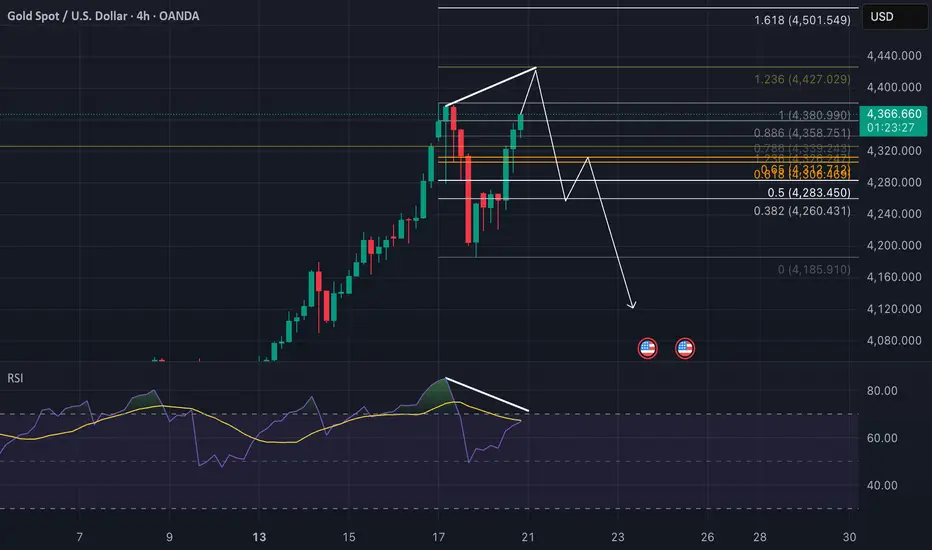 We’ve seen gold climbing recently, hitting a peak around $4,380 before dropping back. The RSI looks like it’s diverging, hinting that momentum might be fading that could be a sign of a reversal incoming!