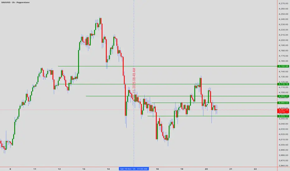 Gold has carved out a Falling Wedge pattern on the 1H timeframe—a classically bullish reversal structure. This compression between converging trendlines (upper resistance at 4,085 and lower support at 4,055) typically resolves with an upside breakout. We're currently bouncing off the lower boundary.