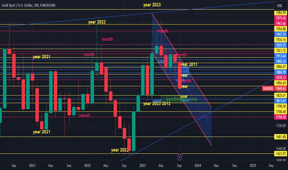 on year chart and month chart huge consolidation formation. Because of govt shutdown coming expecting gold to go up then down again then hue but on year LL, using DXY to reach 107. to 108.4 then drop to 103 area