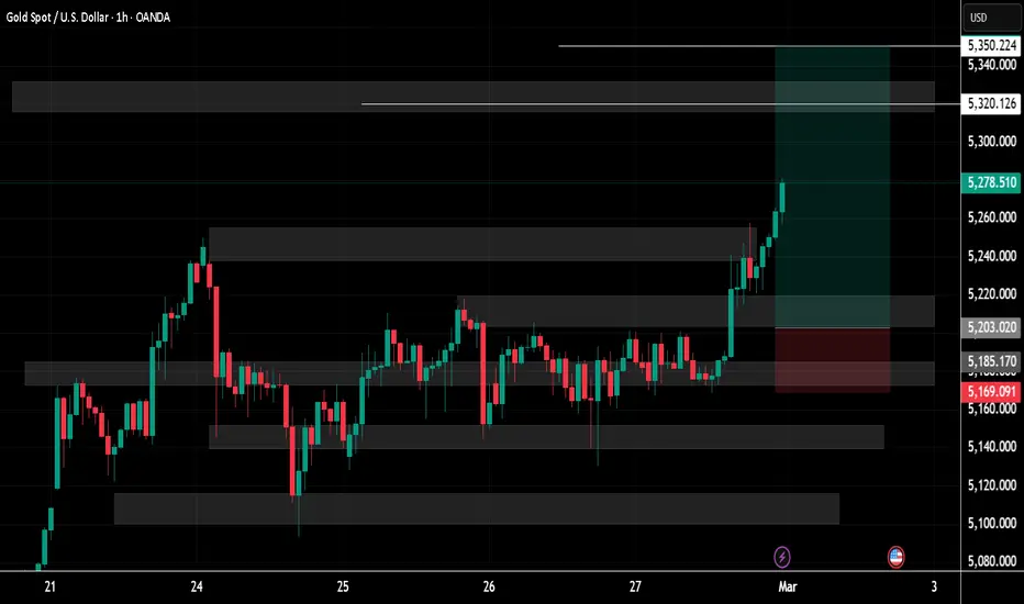 Gold shows a strong bullish continuation after breaking out of a multi-session consolidation range. Price has decisively pushed above the prior resistance zone around 5,220–5,240, confirming a shift in market structure from sideways to bullish momentum.
