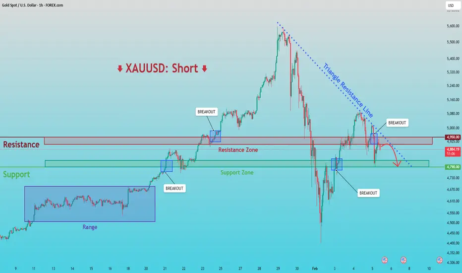 Currently, XAUUSD is trading below a key Resistance Zone around 4,950, which previously acted as support but has now flipped into resistance. Several breakouts above this zone failed, suggesting lack of acceptance and strong seller presence. At the same time, price recently broke below the descending triangle support and is attempting a weak pullback toward the broken structure — a classic bearish retest scenario.