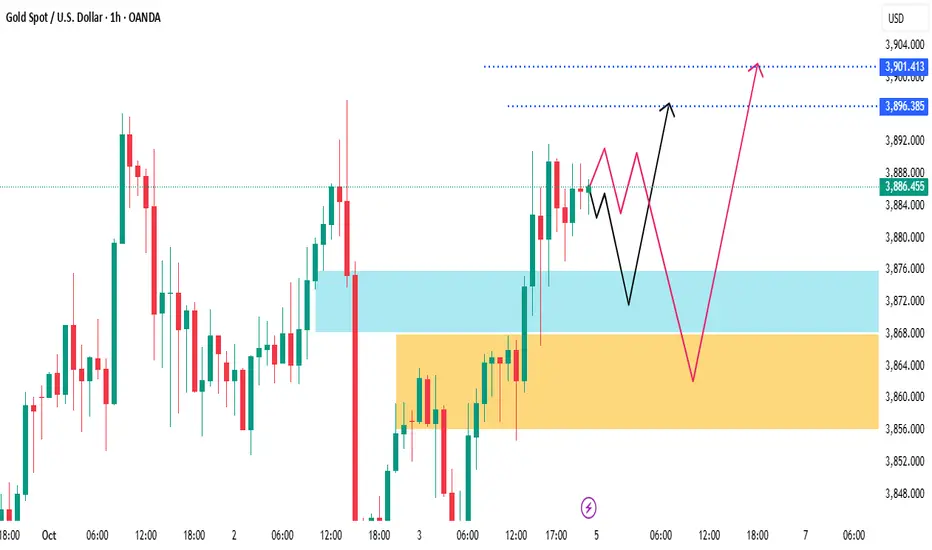 Orange Zone (~$3,856–$3,868): Strong demand zone — deeper retracement area.