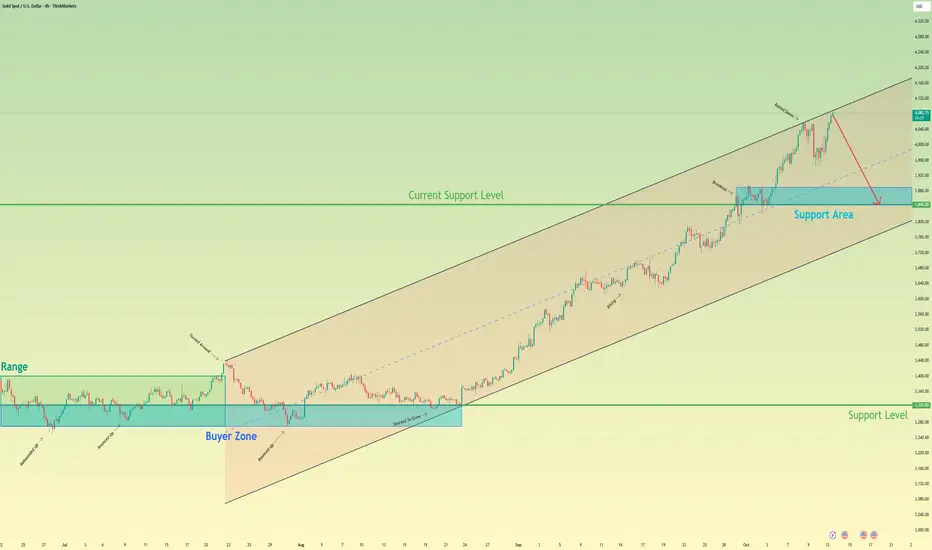 Hello traders, I want share with you my opinion about Bitcoin. The market context for Gold has been strongly bullish since the price action broke out of a prolonged consolidation range that was based in the 3325 buyer zone. This structural shift initiated a new uptrend, with the price action for XAU having been guided higher within a well-defined upward channel. The asset has shown significant strength, breaking through multiple levels, including the current support level at 3845. Currently, after completing a strong impulsive wave, the price is trading very close to the resistance line of this upward channel, consolidating near the highs. In my mind, this is a logical area for the bullish momentum to pause and for a correction to begin. I expect the price to soon be rejected from this channel's upper boundary and initiate a new corrective swing to the downside. I think a confirmed reversal from this area would validate the short scenario. Therefore, I have placed my TP at the 3845 level, targeting the recent breakout area, which should now act as the first major support. Please share this idea with your friends and click Boost 🚀