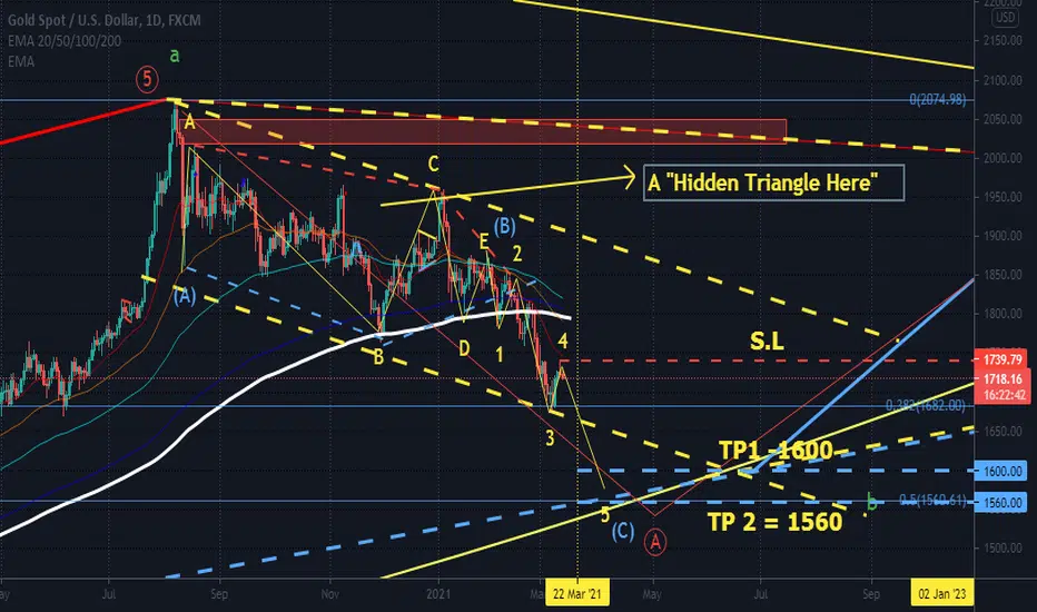 Gold Final Leg Down of Wave A (red, circled ) of Triangle.. Tp 1 @ around 1600, Tp 2 @ around 1560 ( which is Fibo 0.50 % from Dec 2015 low, The Cup bottom line / parabolic arc line, weekly trend line muti - confluence zone/area ) , Sl @ 11 March 2021 High...
