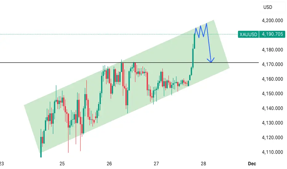 Gold (XAUUSD) is moving inside an upward channel. The price has reached the top of the channel and is showing rejection. The blue M-pattern suggests a possible pullback downward, targeting around the 4,170 zone
