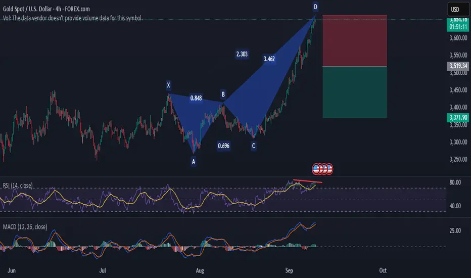 Gold Bearish Divergence and XABCD Pattern is Shown