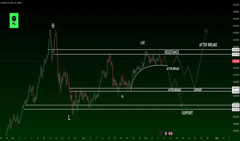 Gold has entered a structural corrective phase after a strong bullish trend that formed a Higher High (HH). This correction is visible in momentum, volume, and market structure with a confirmed Lower High (LH) formation. The combination signals a powerful Decision Point that will determine gold's medium-term direction. 🔄