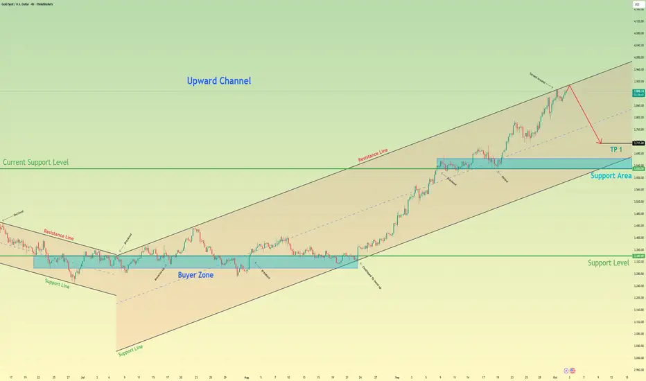 Hello traders, I want share with you my opinion about Gold. The broader market context for Gold has been decidedly bullish since the price reversed and broke out from a prior descending channel. This structural shift established a new uptrend, which has since been neatly contained within a well-defined ascending channel, guiding the price action of XAU higher through a series of higher highs and higher lows. After breaking two key levels, the price has completed another full rotation and is now at a critical inflection point. Currently, the asset is trading very close to the resistance line of this ascending channel. My strategy is based on the expectation that the price will reach this line and then be rejected, initiating a corrective decline. I think that after such a strong run, a pull-back is a probable scenario. A confirmed reversal from this upper boundary would validate the short idea. Therefore, I have placed my TP at 3715 points. As noted, this is an intermediate target not located at a major support zone, designed to capture the initial phase of the anticipated downward correction. Please share this idea with your friends and click Boost 🚀
