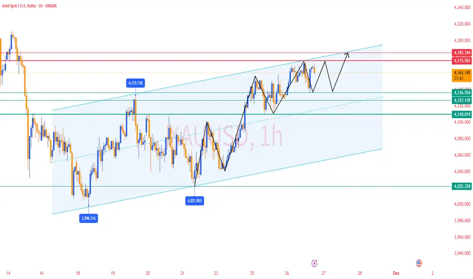 The 1-hour chart shows a weak upward attempt followed by consolidation, and price action above 4170 shows a lack of willingness from buyers to chase higher levels—short-term momentum remains weak.