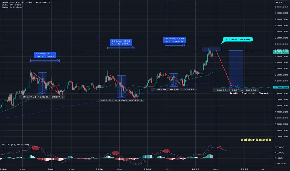 Technical analysis: Last #3 Weekly chart’s (#1W) MACD Selling signals brought approximately (# -15.80%) to (# -17.27%) declines in #140 to #160 sessions. MACD is about to deliver Long-term Selling signal and if one calculates (# -16.00%) decline from current Price-action, #2,000.80 psychological benchmark remains first Long-term Target (followed with #1,800.80 Selling extension of recent High's). Also if Monthly (#1M) chart is correct, every major / mega Bullish rally was aggressively corrected. If I take period from #2.000 Year to ATH’s in #2.011, Gold delivered (# +619.80%) rise, then delivered aggressive multi-Year decline until #2,015 Year. Since #2.015 Year, Gold was gradually soaring until #2.020 Year stagnation which was extended (made a Bullish breakout) on #2.023 Year towards recent record High’s (delivering (# +127.80%) rise. If this is eventual Top, I do expect Gold to continue it’s cycle of multi-Year struggling after delivering / fresh ATH’s at least #500-points ahead.