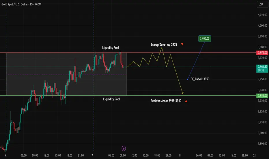Gold remains in a bullish H1 structure but shows signs of distribution near 3975. Liquidity sweeps are forming at highs, while EQ around 3950 acts as a magnet zone.