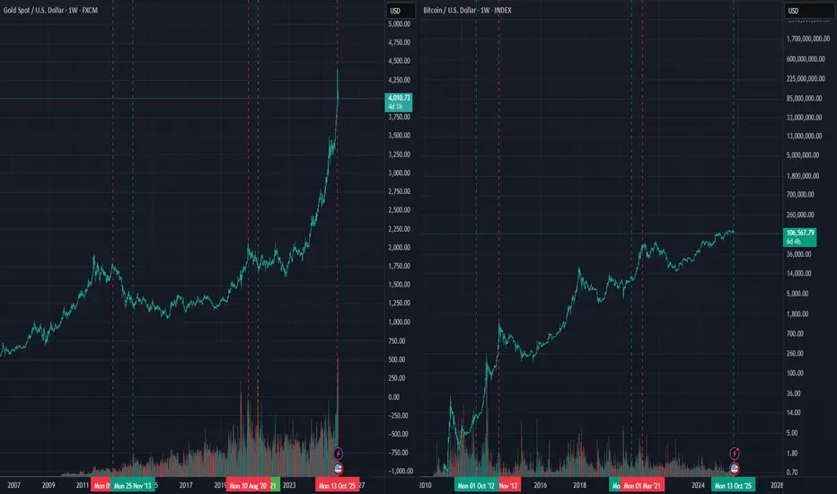 Historical data shows that gold has consistently formed peaks around these times, coinciding with Bitcoin's surges.