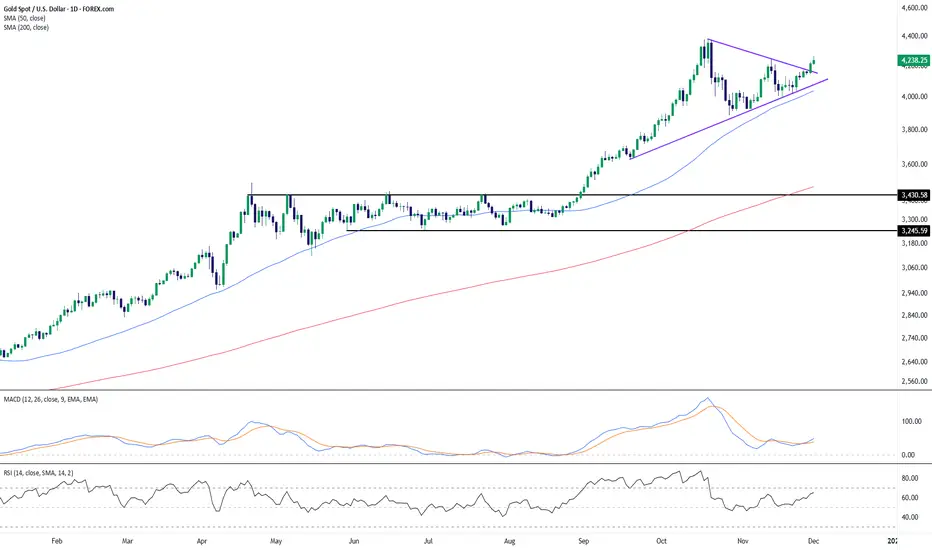 Gold has pushed through the upper boundary of a contracting triangle formation, marking a continuation of the broader uptrend that has been intact since early in the year. The breakout follows several weeks of compression, with progressively higher lows aligning along a rising trendline, while buyers repeatedly tested the upper diagonal boundary.