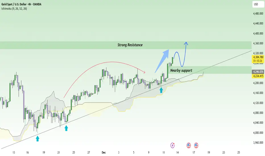 • Price is now approaching a major resistance zone at 4,360 – 4,370. With the current momentum, the likelihood of a slight pullback followed by a breakout is very high.