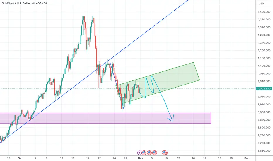 Gold is forming a flag pattern which is interpreted as a sign of further down movement targeting the area of 3850 as a first target.