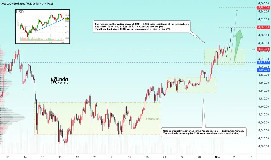A retest of 4245 could end with a pullback within the current consolidation at 4211 - 4245. Two scenarios: If the bulls hold the price above 4245, a rally to 4300 is expected. Otherwise, the market could retest 4215 - 4211 with the aim of a long squeeze before rallying. The trend is bullish, and the fundamental background is relatively positive.