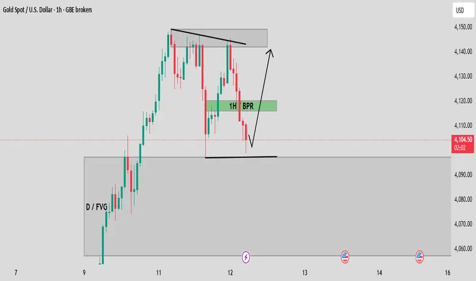 Bullish Continuation: Price uses the D/FVG as support and breaks above the local resistance (around 4,115) to target the recent highs in the 4,140-4,150 zone. (This is the expected move, indicated by the search results suggesting a bullish outlook toward $4,150).