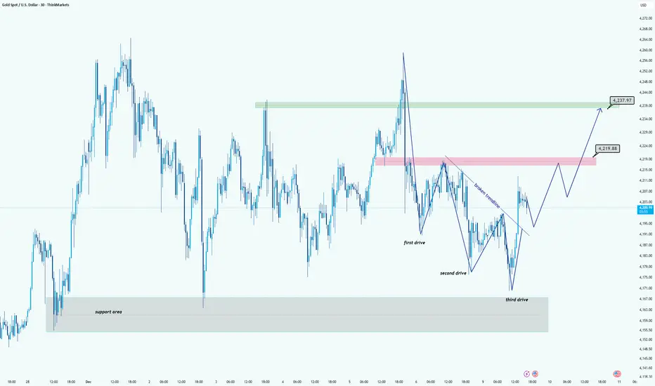 Gold has completed a clear Three-Drive Reversal pattern, with the third drive tapping into the major support zone around 4165–4175. This area has repeatedly acted as a strong demand pocket, and the sharp reaction confirms buyers are still active. Following the third drive, price broke the minor descending trendline, signaling the first shift in short-term momentum.