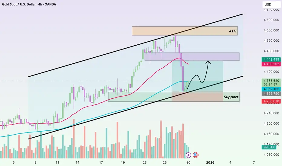 The key takeaway: the larger structure remains intact. Price is still holding above the slower EMA and has not broken the H4 swing low around 4.28x–4.30x. Therefore, this move should be seen as a sharp correction within an uptrend, not a trend reversal signal.