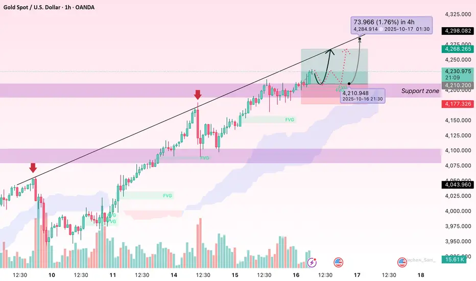 Today, observing the H1 gold chart, I notice that buying pressure remains strong, but recent minor pullbacks indicate the market is seeking balance before the next move. XAUUSD continues a clear uptrend with higher highs and higher lows, alongside multiple Fair Value Gaps (FVGs) forming and filling. The Ichimoku cloud lies beneath the price, sloping upward, creating a solid buffer, while volume slightly narrows near peak candles, signalling a healthy retest before a breakout.