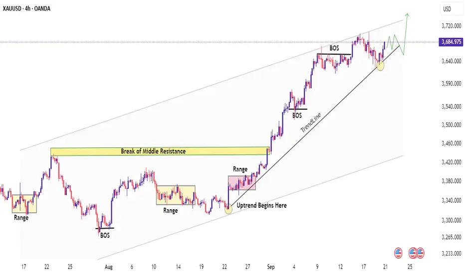 On this 4H chart of XAUUSD, we can see a clear bullish setup forming after multiple breaks of structure (BOS). The price has been ranging in different zones, breaking through mid-level resistance, and recently breaking the main trendline.