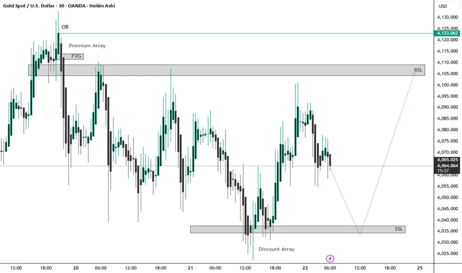 In the lower region, the chart marks a Discount Array and a Sell-Side Liquidity (SSL) pool near the 4,035–4,045 area, hinting at a possible liquidity sweep before a reversal.