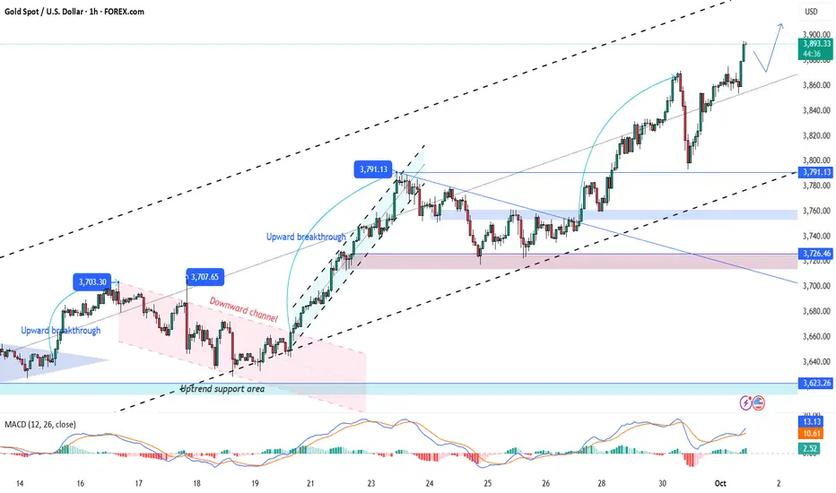 Affected by the US government shutdown crisis, gold bulls have regained momentum, pushing the price towards $3,895, just a stone's throw away from the psychologically important $3,900 mark. Currently, prices are consolidating from their highs. Be wary of short-term fluctuations in this strong market and avoid blindly chasing higher prices.