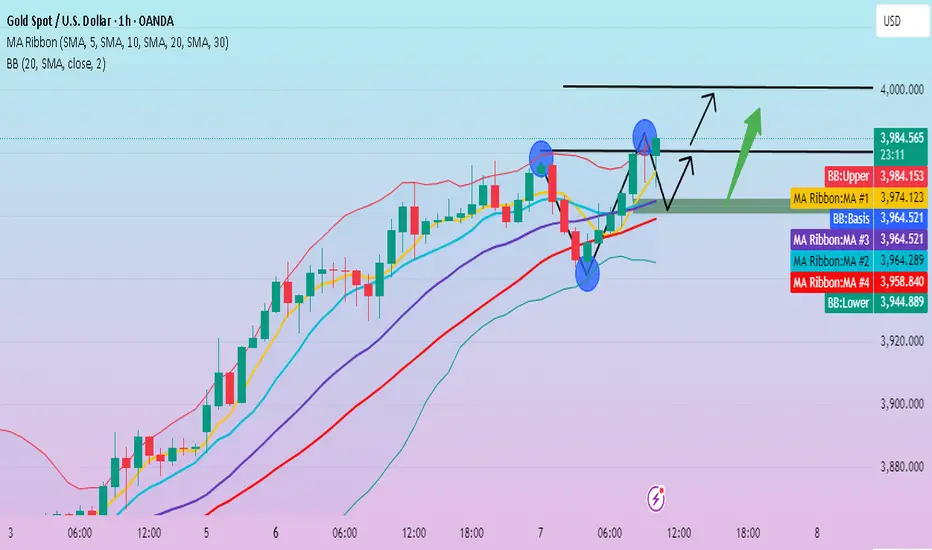 On the 1-hour chart, after a pullback in the European session that touched the lower Bollinger Band, prices rebounded strongly, rising straight up to reach a new high and currently trading near the upper band. The moving average system crosses upward, and the price continues to create new highs along the MA5 moving average.