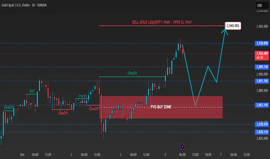 Gold on the 1H timeframe is reacting near 3,928 after a clean structure break and buildup toward the premium zone 3960–3958, where liquidity remains above recent highs. Market structure shows a bullish impulse leg forming, but engineered sweeps at premium supply are likely before continuation. The defined FVG buy zone around 3840–3842 marks discount territory for potential re-entry if price retraces deeper.