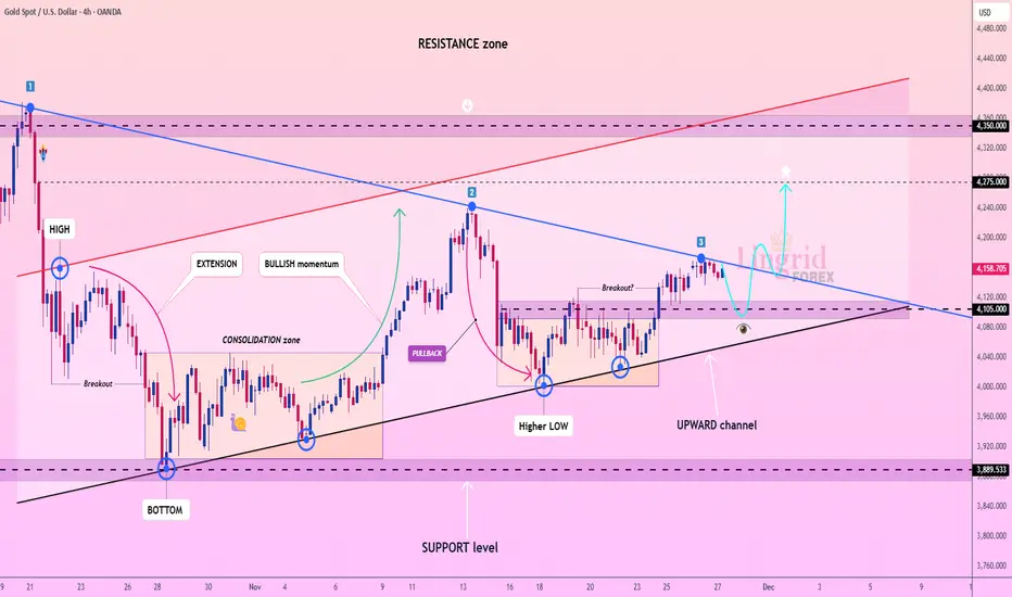➡️ Primary scenario: breakout above trendline → continuation toward 4,275.