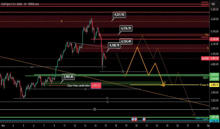 I have three resistances for the pullback and the drawing path, one is the one-hour sellers' equilibrium center of 4124, the next is 4160, and for now, the 15-minute sellers' equilibrium center, which has not yet pulled back, is still 4176 for the 3980 TP, which I will look for a sell trigger if the price returns to these three ranges. This TP is also an important range for 4 hours, which will be withdrawn from the 4-hour buyers if it stabilizes below the equilibrium number, and the targets will be all the liquidity levels specified on the chart.