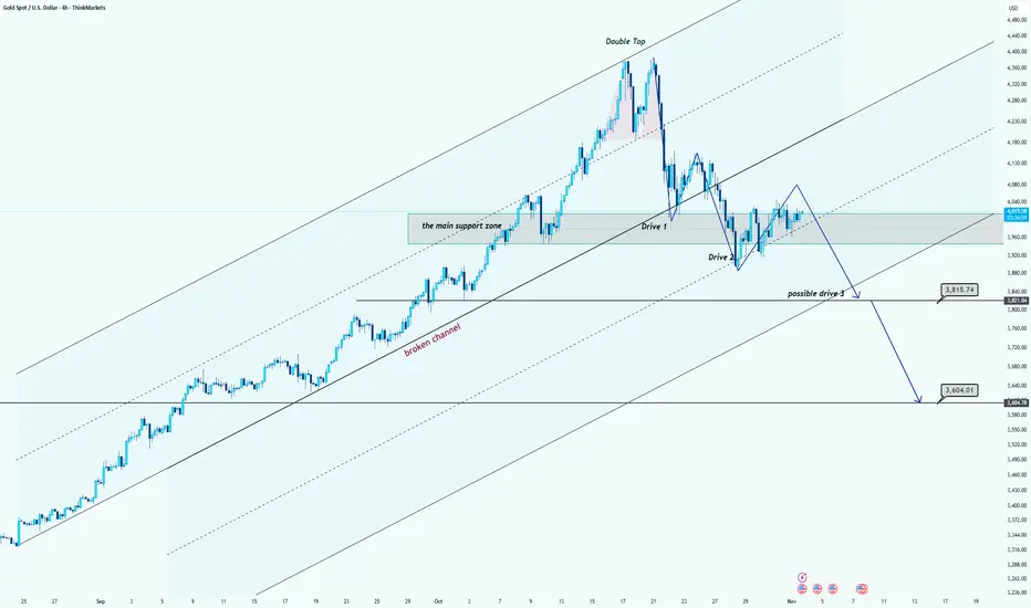 Gold has formed a double top near the upper boundary of a long-term ascending channel, signaling potential exhaustion of the bullish momentum. After breaking below the local support and retesting it, price created a lower high, which confirms a short-term bearish structure.