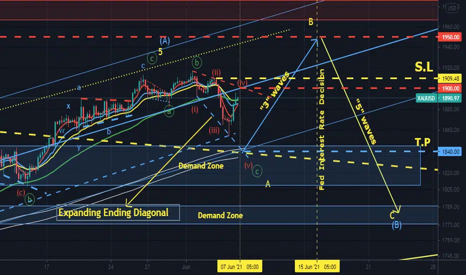 Gold maybe is forming an expanding ending diagonal, Short at around 1900, ( where is an intersection of down trend line with pitchfork median line ). Stop Lost at 1910..Target Profit at around 1840 << where there is an intersection of 1) 4h 200 EMA 2)Pullback Zone of Long Term Down Trend line Breakout 3) Pitchfork lower support line..>>