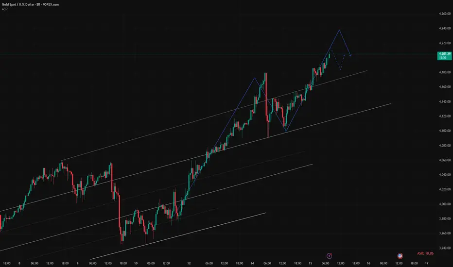 After completing the 4067 resistance-to-support transition, gold continued its upward momentum and is now approaching the 4200 level — a new local high and a critical psychological resistance zone.