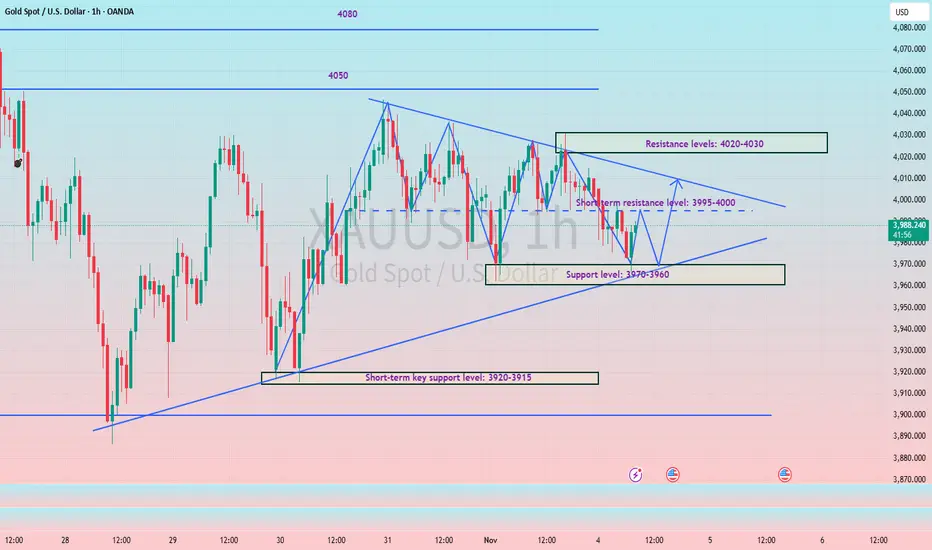 Gold prices stalled at higher levels yesterday, mainly due to Federal Reserve officials' cautious stance on a December rate cut, which boosted the dollar and dampened enthusiasm for gold's rise. Judging from the current trend, the market is in a converging triangle pattern. The daily MA5 is around 3987, and the MA10 is around 4021. It can be seen that the range between these two points is very small, indicating that the market is also preparing to break out and choose a major direction. Once the gold price breaks out of the triangle pattern and chooses a direction, the daily chart's trendline will widen. Therefore, the key resistance level to watch is 4020-4030, while the key support level is 3970-3960. The European session is expected to trade within a range in the short term. Before a successful breakout, pay attention to the resistance level of the middle band on the hourly and 4-hour charts at 3995-4000. If the price touches the resistance level on the first attempt and fails to break through, a small short position can be considered.