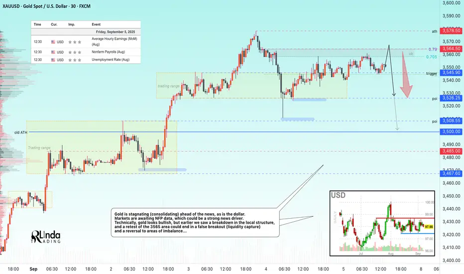 NFP data will determine the short-term trend. A weak report will lead to growth to $3600+, while a strong report will lead to a correction to 3450-3400. Technically, I expect a correction after the local bullish structure breaks down. It is not worth trading on the news; it is better to wait 20-40 minutes after the release to make decisions based on fundamental data.
