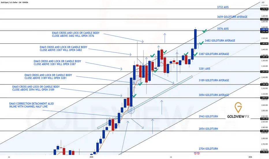 The weekly body close above the channel top at 3576 has now opened the door to the larger 3659 long-term gap target. EMA5 would provide further confirmation if momentum sustains.