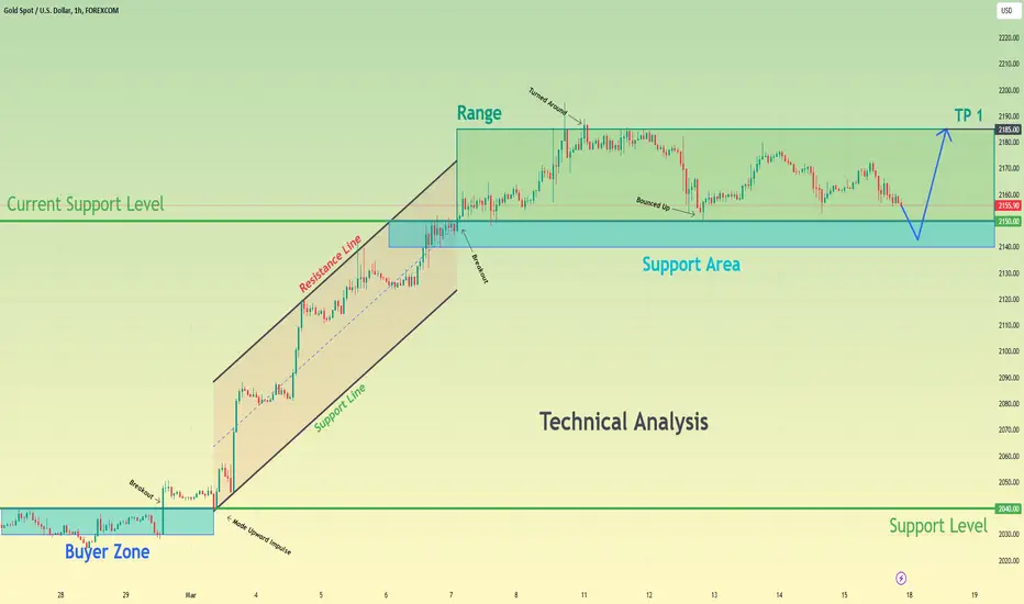 Hello traders, I want share with you my opinion about Gold. Observing the chart, we can see that the price a not long time ago traded in the buyer zone, which coincided with the 2040 support level, and soon broke this level, after which it made a retest. Then price turned around and started to rise in an upward channel, where it in a short time reached the resistance line of the channel, and then made little correction, after which the price continued to move up to the current support level, which coincided with the support area. When Gold reached this level, the price broke it and later exited from the channel, but at once started to trades in a range, where XAU rose to the top part. After this movement, Gold turned around and declined to the 2150 level, but soon it rebounded and tried to back up, and failed. So, at the moment, Gold continues to trades near the current support level in the range, for this reason, I think the price can decline to the support area, where it will turn around and start to grow to the top part of the range, making a fake breakout of 2150 level. Therefore I set my target at 2185 points. Please share this idea with your friends and click Boost 🚀