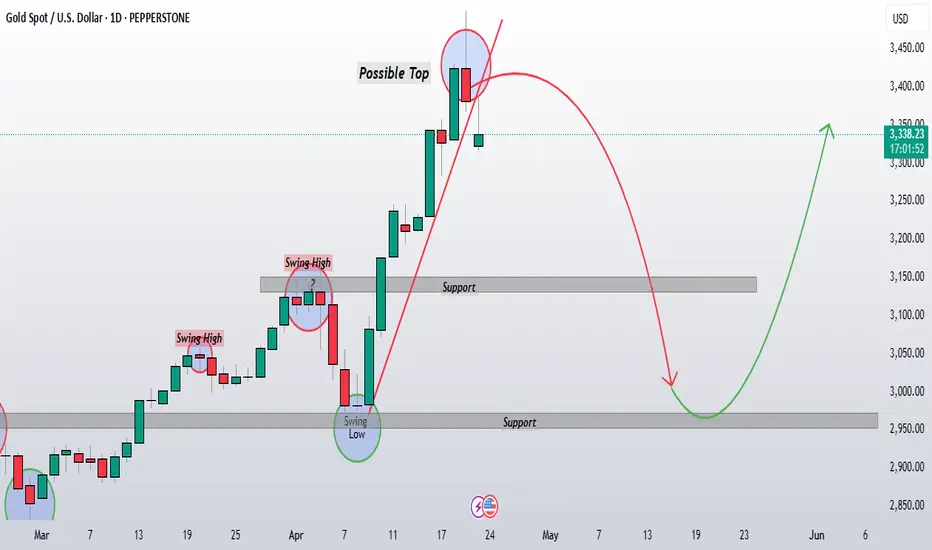 Gold finally showing strong signs of a potential top formation after an extended bullish run. After weeks of anticipation, yesterday's price action finally delivered a significant rejection candle at the psychologically important 3500 level, which could be the reversal signal we've been waiting for .