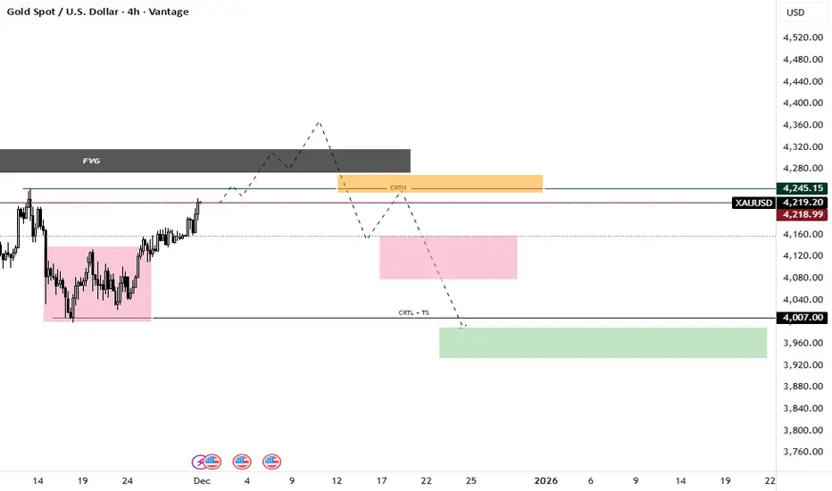 The Trap (Manipulation Phase): The current price action suggests we are in the manipulation phase. Price is drawing up into the FVG (Fair Value Gap) and the CRTH (Candle Range Theory High). This area acts as a magnet to induce early buyers and purge stops resting above recent highs. This is the "Purge" phase of the CRT cycle.