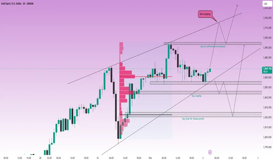 Volume Profile indicates the POC around 3840–3850, an important level for potential scalping buys.
