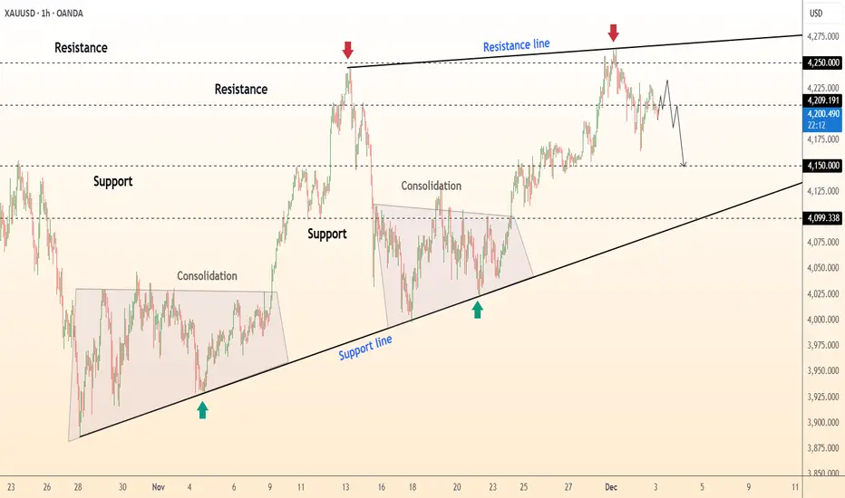 ● XAU/USD rejected the upper resistance line three times, forming a clear bearish reaction near 4250. Price is losing momentum and sliding back toward the mid-range support after failing to sustain highs.