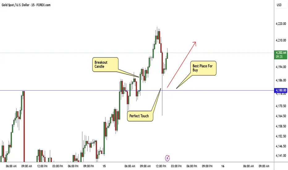 Here is My 15 Min Gold Chart , and here is my opinion , the price going up very hard without any correction so we should move with it and we have a 4H Candle closure above our Res 4180.00 And Perfect Breakout and this give us a very good confirmation , so we have a good confirmation now to can buy after the price go back to retest the broken area 4180.00 One more time and we have already a great touch that take all stop losses before going up so i think the second touch will be better and will give us a good chance to enter with good stop loss , and we can be targeting 100 to 300 pips . if we have a daily closure below this area this mean this idea will not be valid anymore .