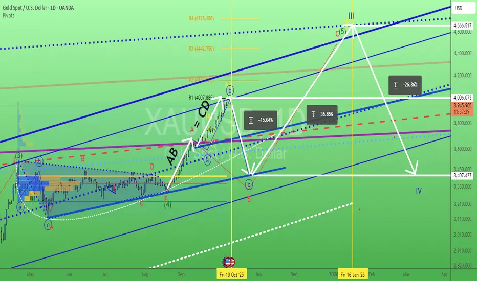 XAUUSD nonstop surging need some profit taking? what event trigger the heavy sell off? Coming this Friday delayed NFP? "time / cycle - wise" Look like "some cash out" not just from Gold but also equities market?. 4007.885 are the confluence zone of 1) Monthly R1 2) Parallel Line Resistance 3) AB = CD price volume. and many...P/s all impulsive wave consist of abc subwaves not 1,2,3,4,5 waves