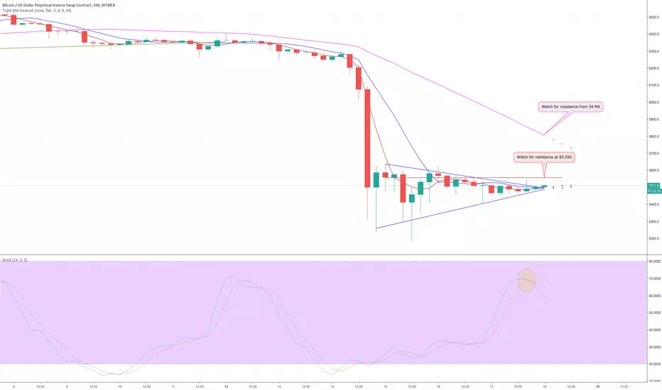 If we rally through that area then I will be expecting resistance from the 9 day MA and the 34 MA on the 4h chart. Those are waiting at $5,800 - $5,880. Anywhere above $5,800 will be a very low risk / high reward shorting opportunity.